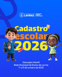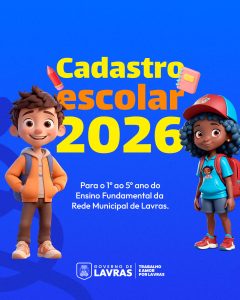 O Governo de Lavras anuncia o período de cadastro escolar para o ano letivo de 2026, destinado aos estudantes do 1º ao 5º ano do Ensino Fundamental da rede municipal. As inscrições estarão abertas entre os dias 1º e 31 de outubro de 2025, devendo ser realizadas na Secretaria Municipal