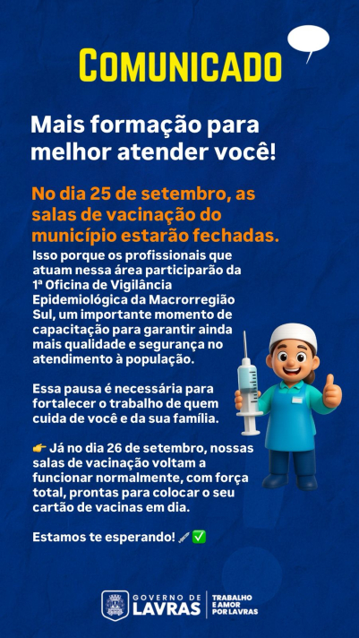 No dia 25 de setembro, as salas de vacinação do município estarão fechadas. Isso porque os profissionais que atuam nessa área participarão da 1ª Oficina de Vigilância Epidemiológica da Macrorregião Sul, um importante momento de capacitação para garantir ainda mais qualidade e segurança no atendimento à população. Essa pausa é